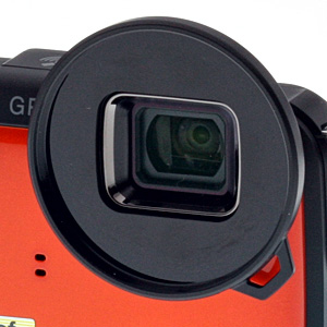 The retail package includes a plastic filter adapter disc that slips around the rectangular lens housing to provide a 40.5mm filter attachment. The adapter merely snaps on, so a small cord is provided to tether the disc to the camera. Note, though, that the AF-assist lamp and movie illuminator is blocked with the adapter attached.