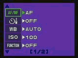 Image contrast and sharpness adjustments are available through the Mode Setup menu, and a Function menu option allows you to capture images in black and white or sepia tone (with additional White Board and Black Board settings for capturing text). An adjustable Automatic Exposure Lock (AEL) function locks an exposure reading, without having to hold down the shutter button halfway while you reframe the image. AEL must be activated through the Capture menu, and can be based on a single exposure reading or up to eight averaged spot readings for more accurate exposures. There's also a 12-second self-timer option for self-portraits, and an infrared (IR) remote controller with a three-second shutter delay.