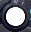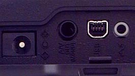 Adjacent to the left side eyelet is the cable connector cover, a second hinged plastic door that covers the DC-In, Video Out, and USB connector ports. A five-pin external flash sync connector is set in the lower left corner of the side panel, concealed by a small (and easily lost!) black plastic cover. Diagonally from that is a diopter adjustment control for the optical viewfinder.