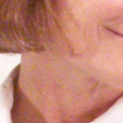 Noise-suppression systems in digital cameras tend to flatten-out detail in areas of subtle contrast. The effects can often be seen in shots of human hair, where the individual strands are lost and an almost "watercolor" look appears. The crop at far right shows this, with lower-contrast areas of Marti's hair showing only limited detail, even though individual strands are quite visible against her cheek in the uncropped image. (Do note though, that the level of detail loss shown here isn't all that obvious on prints smaller than 8x10 inches though.)