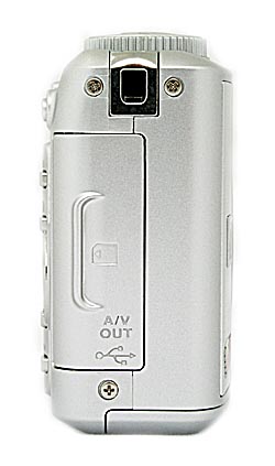 On the right side of the camera (as viewed from the rear) is the SD/MMC memory card compartment, beneath a hinged, plastic door. Opening the door reveals the actual card slot, as well as the USB/AV Out shared connector jack. Directly above the compartment is the eyelet for attaching the wrist strap.