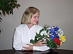 High contrast at the default setting, but good color and detail. The extreme tonal range of this image makes it a tough shot for many digicams, which is precisely why I set it up this way. The object is to hold highlight and shadow detail without producing a "flat" picture with muddy colors, and the C-4000 responded with very high contrast. The shot at near right was taken with the C4000's default contrast setting, and a positive exposure compensation of 0.7EV. The shot at far right was taken with a +0.7 EV exposure compensation adjustment, and a -5 contrast adjustment, showing significantly better tonality throughout the image. I chose the Auto white balance setting as the most accurate overall, although it produced results quite similar to those obtained with the Daylight setting. Manual white balance produced a very warm image. Although just slightly warm, the color here is really excellent. Marti's skin tones look very good, and the hue of the blue flowers in the bouquet is almost dead-on. (Great results, as this is often a difficult blue for digicams to get right.) The red flowers in the bouquet are a little bright, but the high saturation there doesn't seem to wash out any detail. Fine detail is impressive throughout the frame, especially in the flowers and Marti's skin, as well as in the shadow areas. An excellent job! To view the entire exposure series from +0.3 to +1.0 EV (with a -5 Contrast adjustment), see files C40OUTAP1CONM5.HTM, C40OUTAP2CONM5.HTM, and C40OUTAP3CONM5.HTM on the thumbnail index page. |