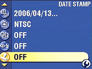 Date Stamp: Turns the date stamp function on or off, which records the date over the image. You can choose from a selection of date formats as well. - Video Date Display: Like the Date Stamp option above, imprints the date and time on video files, with a choice of display formats.