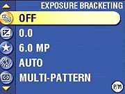 Exposure Bracketing: Enables the auto exposure bracketing mode, with EV step sizes of either 0.3, 0.7, or 1.0 EV units. - Exposure Compensation: Adjusts the overall exposure in one-third-step increments from -2 to +2 EV.