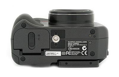A feature missing from the E-300 EVOLT digital SLR is found here in the Olympus C7070 Wide Zoom: a battery retention latch to keep the big expensive battery from falling free when you open the main battery door. Dropping these $50 babies usually results in their death, so any extra effort on the part of the manufacturer to minimize this possibility is appreciated.