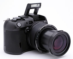The Camedia C-8080 Wide Zoom represents an evolution of the previous top-end C-5060 model, combined with user interface elements borrowed from some of Olympus' earlier pro models, such as the E-10 and E-20. The 5x wide-angle zoom lens reaches to 28mm, and offers a very "fast" maximum aperture range of f/2.4 to f/3.5, unusual in a longer-ratio zoom lens. Besides the 8-megapixel CCD, new long/fast zoom lens, and improved user interface, the C-8080 also incorporates a phase-detection autofocus system using an external phase-detect sensor for faster autofocus performance. While I've seen phase-detect AF systems in some other cameras produce very ho-hum autofocus speed, the system in the C-8080 does appear to help AF speed a great deal, as the camera's overall shutter lag is among the best that I've seen in a prosumer camera.