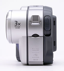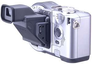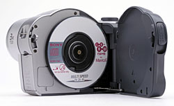 The CD-R compartment takes up the entire left side of the back panel, with the rear surface of the compartment door holding several camera control buttons and the LCD monitor. The compartment door flips open when the release lever is opened, but does not deactivate the LCD monitor. Instead a message on the LCD monitor reads "Cover Open." A tiny, red LED lamp above the LCD monitor lights whenever the camera is accessing the CD-R.