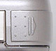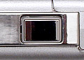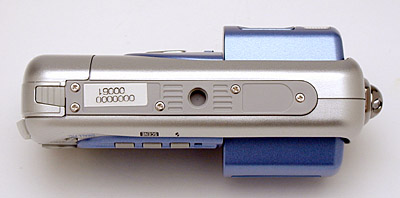 The 2500's smooth top panel features the sliding power switch and Shutter button. The power switch features a very sleek design, and also serves as a mode switch. The first position (from the right) is the Off position, followed by Record and Playback settings. The shot above of a prototype camera shows this switch as unmarked, but production models have raised icons indicating "off," "record," and "play" options. You can also see the pad (with raised bumps for better gripping) that opens the battery compartment door.