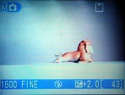The 2500 is equipped with a 3x, 5.6-16.8mm lens (equivalent to a 37-111mm lens on a 35mm camera), with a maximum aperture of f/2.7 to f/4.8 (depending on the lens zoom position). A Close Up shooting mode (available through the Scene menu) captures macro subjects, and focus remains under automatic control at all times. In addition to the optical zoom, the 2500 also offers an approximate 2x digital zoom, though I always remind readers that digital zoom always decreases the overall image quality because it simply enlarges the central pixels of the CCD image. Most likely the result of an effort to keep the camera size to an absolute minimum, the 2500 left off an optical viewfinder in favor of a 1.5-inch color LCD monitor for composing images. The LCD monitor includes a detailed information display, but does not report aperture or shutter speed settings.