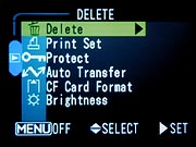 - Protect: Activates the index display, so that individual images can be marked for protection. "Protected" images won't be deleted with a "Delete All" operation, but will disappear if the card is formatted.