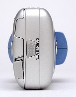 When the lens is stowed, the 2500's front panel is very smooth and almost flat. Once the lens is rotated forward into its operating position, it only extends about a half-inch from the camera's front (also about a half-inch from the camera's back). The lens surface is protected by a clear plastic shield, which remains in place at all times. There is the potential that the shield could get scratched, but returning the lens to its stowed position before putting it away should prevent any significant damage. At the most, I think you'll have to clean finger smudges. (Probably fairly often.) Sharing the front of the lens assembly is the camera's built-in flash. A Self-Timer lamp centered within the silver medallion on the non-rotating part of the front panel lights red whenever the Self-Timer is counting down. Though the 2500 doesn't offer a bulky handgrip, the front of the camera does feature a small indentation that offers some purchase for your fingertips as they grasp the camera.