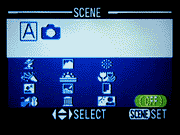 Scene Menu (Capture mode only,) This is the heart of the Coolpix 2500 for "average" users. The scene mode options set up the camera for a wide variety of common shooting situations that would otherwise require multiple setting adjustments, tweaking lens aperture, shutter speed, white balance, ISO (light sensitivity), etc. The bottom line for this mode is that you can come back with very nice shots from tricky shooting situations, without having to understand the first thing about f-stops and shutter speeds. The options in this mode are as follows: