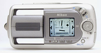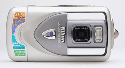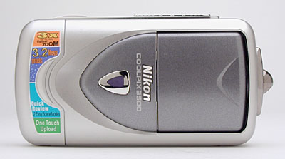 When the lens is stowed, the 3500's front panel is smooth and almost flat. Once the lens is rotated forward into its operating position, it only extends about a half-inch from the camera's front (also about a half-inch from the camera's back). The lens surface is protected by a clear plastic shield, which remains in place at all times. There is the potential that this shield could itself get scratched, but returning the lens to its stowed position before putting it away should minimize the potential for any damage. At the most, I think you'll have to clean finger smudges. (Albeit fairly often.) Sharing the front of the lens assembly is the camera's built-in flash. A Self-Timer lamp centered within the silver medallion on the non-rotating part of the front panel lights red whenever the Self-Timer is counting down. Though the 3500 doesn't offer a bulky handgrip, the front of the camera does feature a small indentation that contributes a surprising amount to a secure grip.