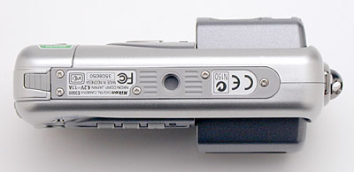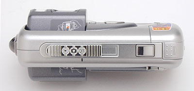 The 3500's smooth top panel features the sliding power switch and Shutter button. The sleek, low-profile power switch also serves as a mode switch. The first position (from the right) is the Off position, followed by Record and Playback settings. You can also see the slightly ridged pad that opens the battery compartment door.
