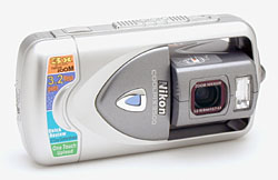 Compact, trim, and not much larger than a standard cell phone, Nikon's Coolpix 3500 updates the previous 2500 model with a larger CCD for even better quality images. The 3500 is practically identical to the previous model, with the same swivel lens design and basic features, but the streamlined exterior now has dark gray accents in place of the metallic blue of its predecessor. The 3500's small size and lack of protrusions enhance its travel appeal, as the camera conveniently fits into shirt pockets, small purses, hip packs, etc. The most interesting design feature is the rotating "internal swivel" lens, which swivels approximately 230 degrees inside the camera's frame, to a range of shooting angles. Because you can "close" the lens by rotating it to a vertical position, there's no need for a lens cap (though the actual lens surface is protected by a clear, plastic shield as well). The 3500's 3.2-megapixel CCD produces high resolution images suitable for making sharp prints as large as 8x10, as well as lower resolution images suited for e-mail attachments. The camera's compact size and attractive looks alone should draw many consumers, but the range of versatile shooting modes and exposure options add depth to its good looks.