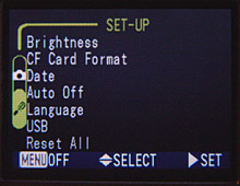 - CF Card Format: Formats the CompactFlash card, erasing all files (even protected ones).