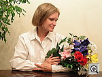 Slight color casts at each setting, but overall excellent handling of this tough light source. Exposure is good as well. This shot is always a very tough test of a camera's white balance capability, given the strong, yellowish color cast of the household incandescent bulbs used for the lighting. Both the Manual and Auto options produced nearly accurate color, though the Manual setting was slightly greenish and the Auto setting a bit magenta. (Incandescent had more trouble, producing a warmer cast.) Despite the slight magenta tint, I chose the Auto setting for the main image. Marti's skin tone is pretty good here, although slightly pink, and the blue flowers are a bit dark and purplish. (Probably to be expected, considering the light source.) Overall, the Coolpix 3500's automatic white balance system performed much better than average on this difficult shot. |