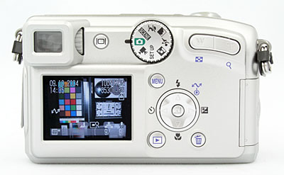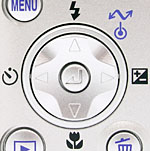 The remaining external controls are all located on the camera's rear panel, along with the 1.8-inch, TFT color LCD monitor and electronic viewfinder eyepiece. A small button just to the right of the eyepiece lets you select between the two displays, and a small ridged knob on the eyepiece housing itself controls a dioptric adjustment for eyeglass wearers. (The viewfinder on the Coolpix 4800 also has a fairly high eyepoint, making it easy for eyeglass wearers to see the entire frame, without having to press their lenses up against the camera body.) At the top of the rear panel is a rotating Mode dial, used to select the camera's primary operating mode. A two-way zoom rocker button in the top right corner controls optical and digital zoom, as well as some Playback viewing options. In the middle right of the back panel is a five-way nav disk, which accesses Flash, Macro, and Self-Timer, and exposure compensation options, in addition to navigating menu screens. The nav disk has a separate button in the middle for accepting selections, a solution that is easier than trying to press in the entire disk as we've seen in other cameras. This button can also be pressed to initiate picture transfer when the camera is connected to a computer that has the Nikon software loaded onto it. Arrayed around the five-way nav control are the Delete, Menu, and Playback buttons.