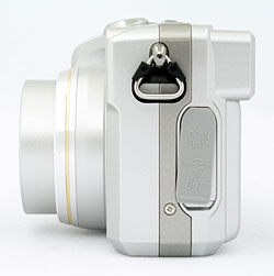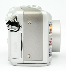 On the right side of the camera is the Secure Digital (SD) memory card compartment and an eyelet for attaching the neck strap. The SD card compartment door flips open toward the back of the camera to reveal the SD card, leaving plenty of room to grasp the card. The card releases with an inward press.