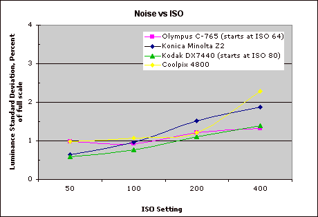 - Image Noise: Slightly higher than average image noise, but more restrained anti-noise processing. As we've moved to higher pixel counts on small CCD chips, image noise has increased. Many current cameras have cranked up their anti-noise processing to manage the increased noise coming from the sensor, but in the process throw away important subject detail in areas of subtle contrast. The Coolpix 4800 manages to walk a good middle ground on this issue, showing slightly higher than average image noise at low ISO settings, but giving up little if any subtle detail to achieve it. The noise takes a sudden jump at ISO 400 though, making that ISO setting useless, IMHO.