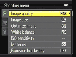 Menu. Mostly unchanged from the previous model, the Menu is comparatively well organized, with items you'd most want to change right at the top of the list: Image Quality, Image Size, Optimize image, White balance, and ISO sensitivity at the top of the list.