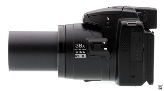While long zooms used to be limited at the wide-angle end, the Nikon P500 sports an ultra-wide-angle lens, starting at 22.5mm! That means less stepping back to get it all in; in fact, many users will do well to zoom in a bit for most photographs. That's made easier thanks to the inclusion of an additional zoom control on the side of the lens, which helps you remain a little more steady as you zoom all the way in to 810mm equivalent. That's such a long zoom that though Vibration Reduction helps, it's hard to keep on target without a steady hand.