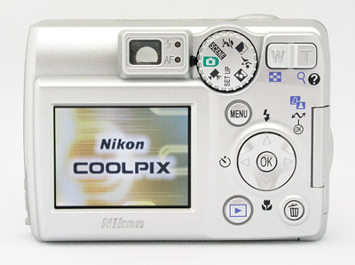 The remaining external controls are all located on the camera's rear panel, along with the 1.8-inch, TFT color LCD monitor and optical viewfinder. Two LEDs next to the optical viewfinder light or flash to indicate camera status, such as when focus is set, the flash is charging, or the camera is accessing the memory card. To the right of the optical viewfinder is the Mode dial, which sets the main operating mode. A Zoom rocker button is just to the right of that, and controls optical and digital zoom, as well as some Playback viewing options. In the center of the back panel is a five-way disk-shaped controller, which accesses Flash, Macro, and Self-Timer options, in addition to navigating menu screens. The nav disk has a separate button in the middle for accepting selections, a solution that is easier than trying to press in the entire disk as we've seen in other cameras. This button can also be pressed to initiate picture transfer when the camera is connected to a computer that has the Nikon software loaded onto it. Just below the nav disk are the Playback and Erase buttons, and the Menu button is just above it.