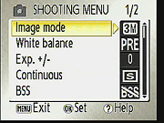 - Image Mode: Sets the image resolution and compression. Choices are 5M High (2,592 x 1,944 pixels), 5M Normal (2,592 x 1,944 pixels), 3M (2,048 x 1,536 pixels), PC Screen (1,024 x 768 pixels), and TV (640 x 480 pixels).