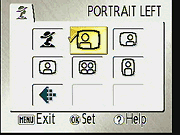 Portrait Assist Mode: Labeled on the Mode dial with a woman in a hat, this mode is best for portraits, and is the first of the camera's "Assist" modes. In Portrait mode, the camera uses a larger lens aperture to decrease the depth of field, producing a sharply focused subject in front of a slightly blurred background. Pressing the Menu button calls up the Scene Assistance menu, which lets you choose from a range of portrait setups, including basic Portrait, Portrait Left, Portrait Right, Portrait Close-up, Portrait Couple, and Portrait Figure. In each of these modes (except basic Portrait), an outline appears on the LCD display to help you align the subject, and the camera adjusts its exposure and focus settings to match the indicated framing.