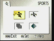 Sports Assist Mode: A figure in action is the icon for Sports mode, which uses faster shutter speeds to freeze action. The Menu button accesses the Scene Assistance menu, with options for Sports, Sport Spectator, and Sport Composite modes. Sport Spectator enables the user to instantly press down on the Shutter button without pausing halfway to focus, and works best with unpredictable subjects within a range of 9.8 feet (3.0 meters). Sport Composite mode takes 16 images in two seconds, each time the Shutter button is pressed, and arranges them in a four-by-four array, much like Multi-Shot 16 mode.
