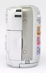 On the right side of the camera is the Secure Digital (SD) memory card compartment and an eyelet for attaching the wrist strap. The hinged SD card compartment door opens with a pull toward the back of the camera, and opens wide enough to grasp the card. The card releases with an initial inward press. Also visible from this side is the tiny plastic door that slides up out of the way to make room for the cord when using the optional AC adapter pack.