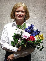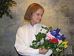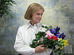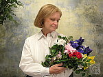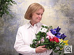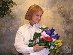 Very good results, although slight color casts with all three white balance settings. Less than average exposure compensation required. This shot is always a very tough test of a camera's white balance capability, given the strong, yellowish color cast of the household incandescent bulbs used for the lighting. I chose the Auto setting as the best looking here even though it was a hint reddish. The Incandescent setting resulted in a stronger yellow cast, and the Manual white balance setting produced an image that was a little greenish-looking. The reddish cast turns Marti's skin tones a little warm, and color in the flower bouquet is a little reddish as well. The blue flowers are slightly dark and purplish, but that's almost to be expected with this difficult light source. The main shot was taken with a +0.7 EV exposure compensation adjustment, as anything brighter overdid the highlights on Marti's shirt. To view the entire exposure series from zero to +1.3 EV, see files CP84INMP0.HTM