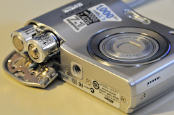 To power the L14, Nikon chose the commonly available AA battery. Two of them fit into the slim grip compartment. I used Energizer lithiums, rated for 1,000 shots. You can leave them on the shelf for 10 years without depleting them, great for intermittent use. Another bright alternative are rechargeable Sanyo Eneloop batteries, commonly available at camera stores, that should last 19 years with heavy use. They hold most of their charge over months, unlike normal NiMH rechargeables. Again, great for intermittent use.