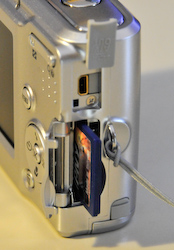The seven megapixel maximum image size will let you store about six images in internal memory or 70 on a 256MB SD card. The card slot is located on the right side of the camera by the camera strap eyelet and USB port. But remember, the Nikon L14 is fun, so you're going to want a bigger card, something like a 2GB.