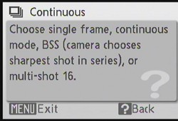 Oh, there's a third thing I like. The Help button. In the menu system, pressing the Telephoto end of the Zoom lever displays a help screen for whatever option is selected. Press it again and you're back in the menu system. Very simple, very nice. Why should Help be hard to use? On the Nikon L14 it's kind of fun.
