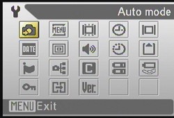 Auto Menu. Image size, White Balance, Shutter mode, Color options, Setup.