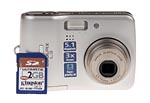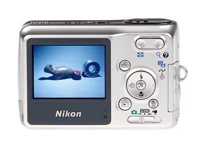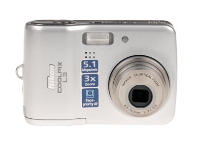 The Nikon L3's front panel contains the 3x zoom lens, built-in flash, built-in microphone and the self-timer lamp. A shutter-like lens cover protects the lens when not in use, and automatically slides out of the way when the camera is powered on (eliminating the hassle of keeping track of a lens cap). When powered on, the lens telescopes out an additional 1/2-inch (or a whole inch from the body) into its operating position. A slight swell in the body beneath the Shutter button acts as a handgrip, and comfortably aligns your fingers as they wrap around the Nikon Coolpix L3.