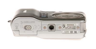 The Nikon Coolpix L3 has a flat bottom panel. The battery compartment door and plastic tripod socket are next to each other making quick battery changes while mounted to a tripod a little tricky. The hinged, plastic door covers the battery compartment, releasing with a sliding switch, which then allows the entire door to slide to the right and swing open. The two AA batteries will fall free when this door is opened.