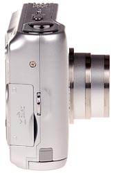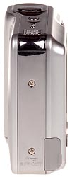 On the opposite side of the Nikon Coolpix L3 is the connector compartment, protected by a rubbery cover that remains attached to the camera; beneath is the Video Out / USB jack. The rest of the left side of the camera is taken up by an attractive chrome band.