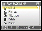 Set-Up: Takes you directly to the Set-Up menu. - Print Set: Sets the DPOF settings for captured images. The Print Selected option brings up an index display, letting you mark individual images for printing. Once images are marked, you can decide whether any text is overlaid on the image (like image information or date and time). You can also cancel print settings here with the Delete Print Set option.