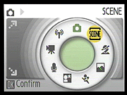 Scene Exposure Modes: Select "Scene" on the circular Mode menu display to select among the 11 preset scene modes by pressing the Menu button. All of the scene modes preset a variety of camera options for you automatically. The Mode menu includes four scene modes with Scene Assist help you frame your shots: Portrait, Landscape, Sports, Night Portrait. Scene modes from Party/Indoor on down are available under the Scene option of the Mode menu by pressing the Menu button.
