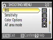 BSS: Best Shot Selector shoots up to 10 shots and picks the one with the least blur from camera shake or poor focus. Flash is automatically turned off in this mode, since it is intended for capture of natural light photos in low light. The Exposure BSS option can bias the selection toward highlight or shadow detail or best overall exposure among five shots. - Sensitivity: Selects Auto ISO (ranging to ISO 200) or sets the camera to 50, 100, 200, or 400.