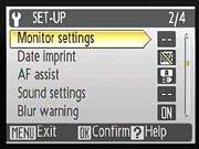- Blur Warning: Turns the camera's Blur Warning on and off. (If off, the "camera shake" icon will not appear on the LCD monitor.)