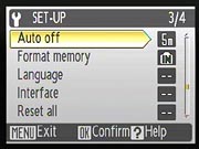 Auto Off: Enables the Auto Off feature, which automatically shuts down the camera after a period of inactivity, to save battery life. Times are 30 seconds, or 1, 5, or 30 minutes. Sleep mode will put the camera in standby mode after 30 seconds regardless of auto off setting if no change in scene brightness occurs; a press on the power button returns the camera to full readiness. - Format Card/Memory: Formats the SD card or internal memory, erasing all files (even protected ones).
