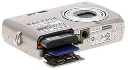 For image storage, the camera offers about 52MB of internal memory, but also has an SD card slot. No card comes with the camera. The internal memory will hold about nine full-resolution images, or about 416 of the lowest resolution. (Compare this to about 40 full-resolution files on a 256MB memory card.) For movies, the internal memory can hold about 47 seconds of the highest resolution setting, though a 256MB card can hold a lot longer at 3 minutes, 40 seconds. Thus, you definitely have some flexibility to grab images with the camera straight out of the box, but I'd recommend picking up a a large capacity SD/SDHC memory card pretty quickly so you don't get caught trying to erase files to make room for new ones on the spot. 2 to 4GB should do.