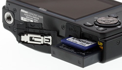 The bottom of the Coolpix S9100 is where Nikon hid the laundry. The metal tripod socket is way off in the left corner under the lens, allowing for easy battery and memory card changes while the camera is mounted on a tripod. Nice. And the USB port is tucked next to the hinge for the battery/card compartment so you have to put the camera on its face or back to connect. Ugh.