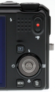 On the back panel, the 3.0-inch, 921,000-dot LCD (yeah, 921K, not 230K like most digicams) sits to the left of the charge lamp and sparse controls, which include a Movie recording button to the right of some thumb bumps, the Playback button above the Scroll Wheel with an OK button in the middle, and the Menu and Erase buttons below the Scroll Wheel. Simple.