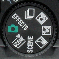 AUTO SCENE. Scene with a heart. That's the icon. The camera selects the appropriate scene mode based on your composition. It's also known as Smart Auto or Intelligent Auto. And, yes, it can slip into Macro mode. Additionally, it knows about Landscape, Night Landscape, Backlighting, Portrait, and Night Portrait modes. If all else fails, it simply shoots Auto. No digital zoom or Smile Timer, though.