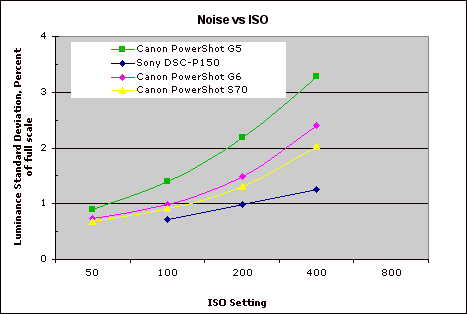 This chart compares the PowerShot S70's noise performance over a range of ISOs