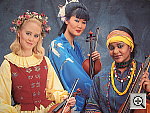 blue robe and red vest, as well as in the instrument details.